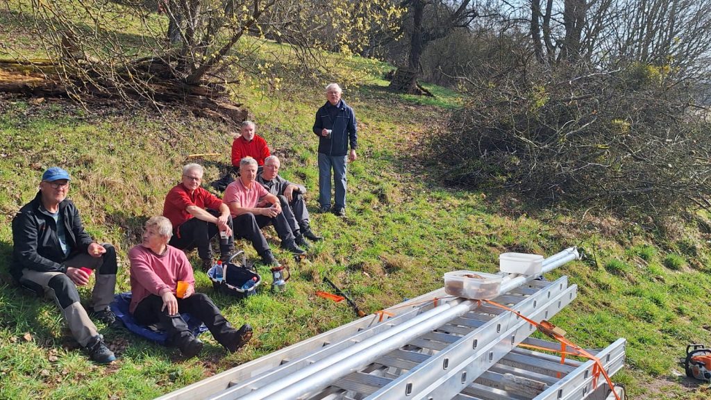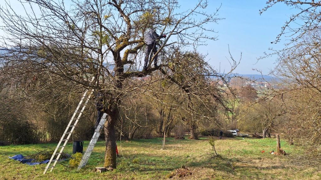 Wir haben Anfang März 2026 versucht, den Misteln, die unsere alten Apfelbäume befallen haben und schwächen, Einhalt zu gebieten. Teilweise mussten große Teile, um ein weiteres Ausbreiten zu Verhindern, entfernt werden. Es war eine gelungene Aktion und das Wetter hat auch gepasst.